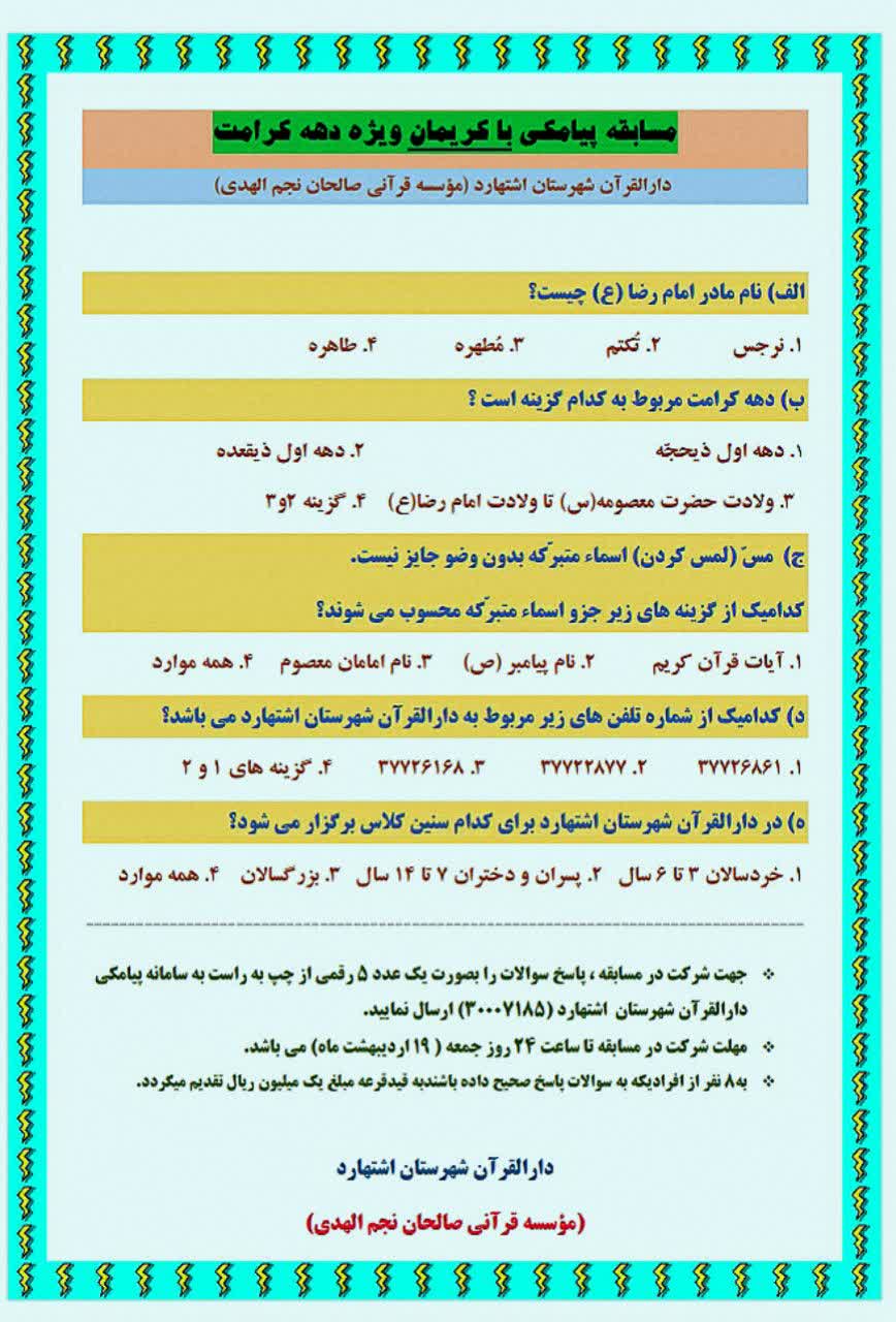 به گزارش پایگاه اطلاع رسانی دارالقرآن شهرستان اشتهارد (موسسه قرآنی صالحان نجم الهدی) قربانی مدیر داخلی از مسابقه پیامکی(با کریمان) بمناسبت دهه کرامت خبر داد .وی گفت : جهت شرکت در مسابقه ، پاسخ سوالات را بصورت یک عدد ۵ رقمی از چپ به راست به سامانه پیامکی دارالقرآن شهرستان اشتهارد (30007185) ارسال نموده و مهلت شرکت در مسابقه تا ساعت ۲۴ روز جمعه ۱۹ اردیبهشت ماه می باشد و به ۸ نفر از افرادیکه به سوالات پاسخ صحیح داده باشند به قید قرعه مبلغ یک میلیون ریال تقدیم می گردد. قربانی یادآور شد : علاقمندان جهت ثبت نام و اطلاعات بیشتر به نشانی اشتهارد-انتهای خیابان شهید چمران-خیابان شهید مطهری- نبش خیابان قدس. ساختمان دارالقرآن شهرستان اشتهارد (مؤسسه قرآنی صالحان نجم الهدی) مراجعه نمایند و در غیر اینصور ت با شماره های تلفن های 37726861 و 37722877 تماس حاصل نمایند . برای دریافت و نمایش سئولات مسابقه روی گزینه دانلود فایل کلیک نمائید .