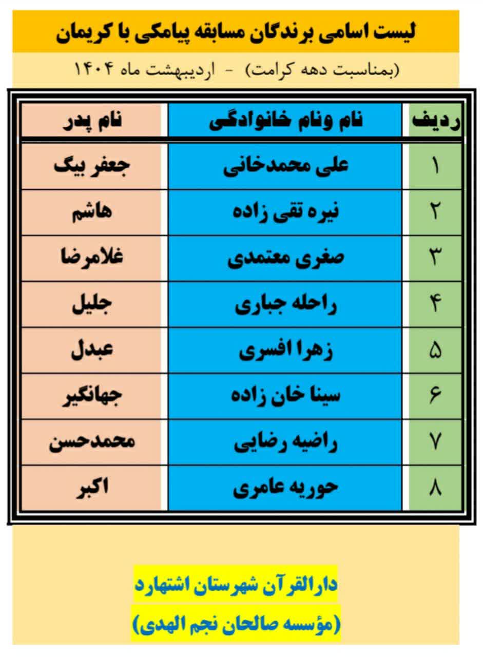 مسابقه پیامکی با کریمان بمناسبت دهه کرامت از طرف دارالقرآن شهرستان اشتهارد برگزار گردید که تعداد ۹۱۵ نفر در این مسابقه شرکت کردند. پس از قرعه کشی از بین پاسخهای صحیح تعداد ۸ نفر بعنوان نفرات برگزیده انتخاب شدند که اسامی ایشان در لیست بالا اعلام شده است. باتوجه در پیش بودن دهه ولایت (در خردادماه) مسابقه ای در این ایام برگزار خواهد شد که نحوه برگزاری و شرایط شرکت در این مسابقه ، متعاقباً اطلاع رسانی خواهد شد.
